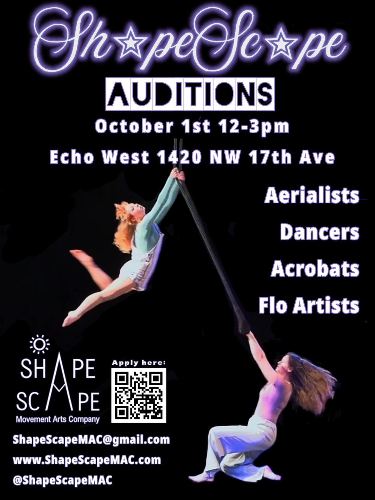ShapeScape is seeking passionate, career-driven movement artists to join our upcoming season. We specialize in aerial, acrobatics, and dance, and we’re booking for performers eager to collaborate across disciplines, grow professionally, and push creative boundaries.About ShapeScape: